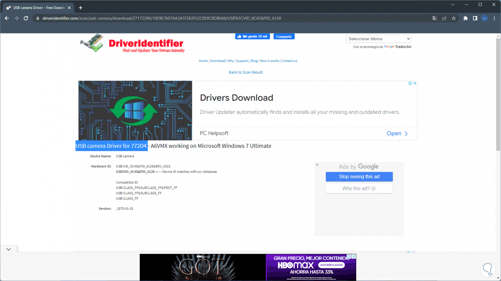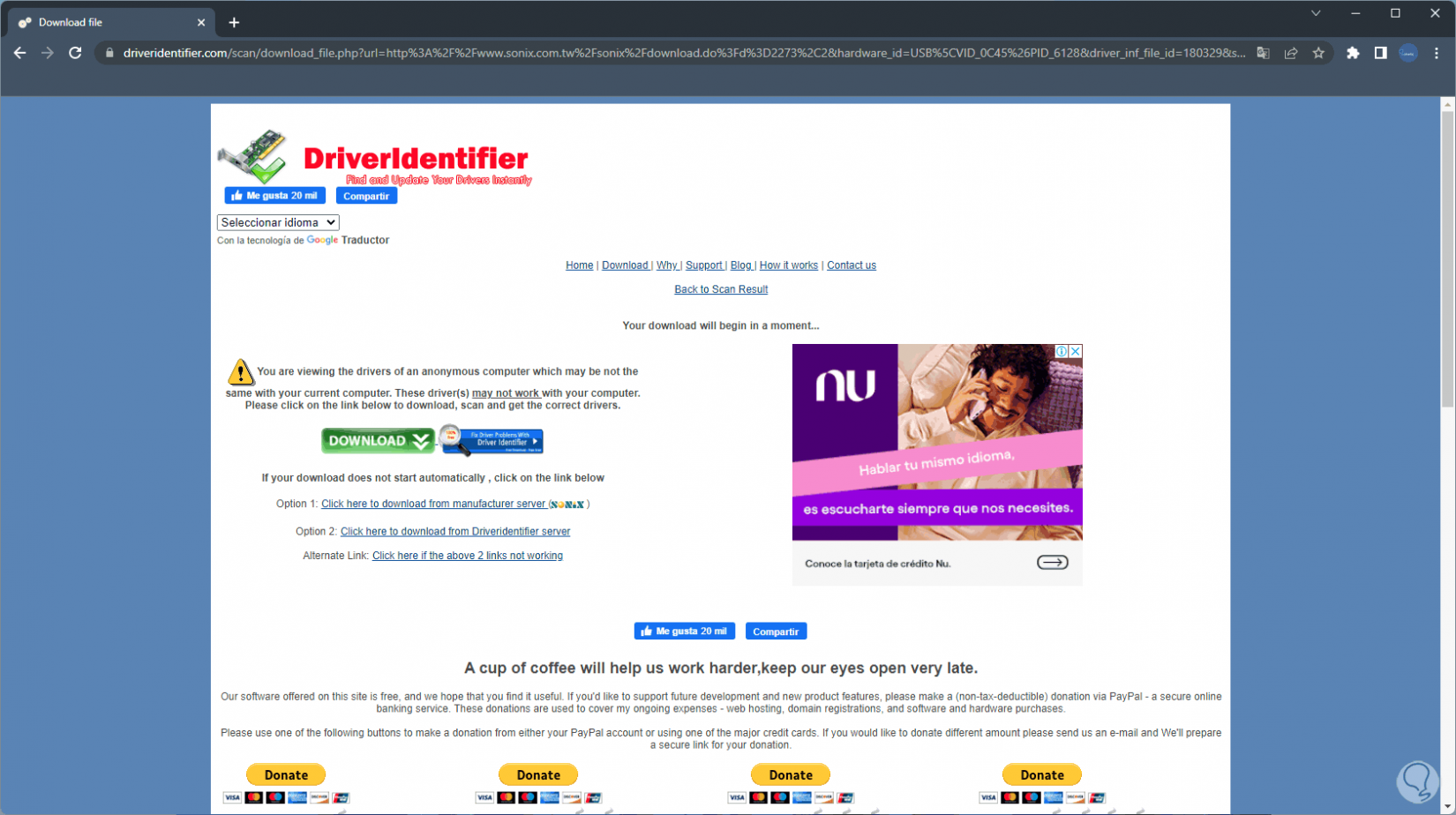 Veremos el tipo de controlador que aparece como desconocido, abrimos alguna de las webs disponibles para descargar el controlador: