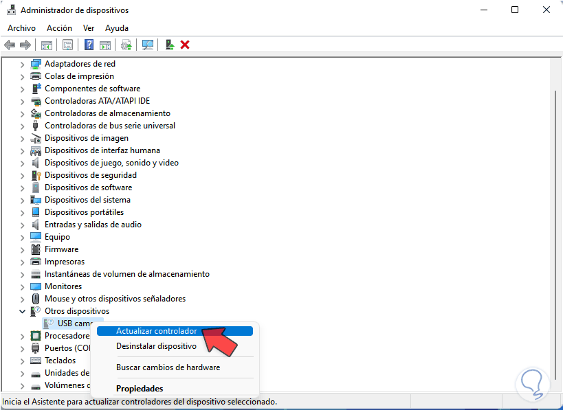 Después de esto, abrimos el Administrador de dispositivos, damos clic derecho sobre el controlador y seleccionamos "Actualizar controlador":