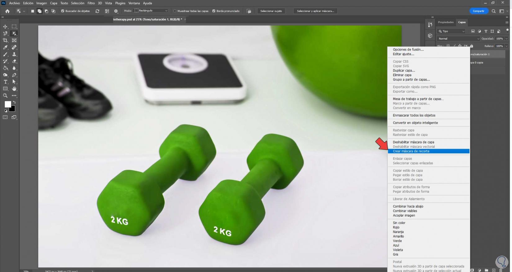 Para que se aplique a nuestra máscara de capa únicamente, haz clic derecho sobre la capa de "Tono y Saturación" y elegimos "Crear mascara de recorte"