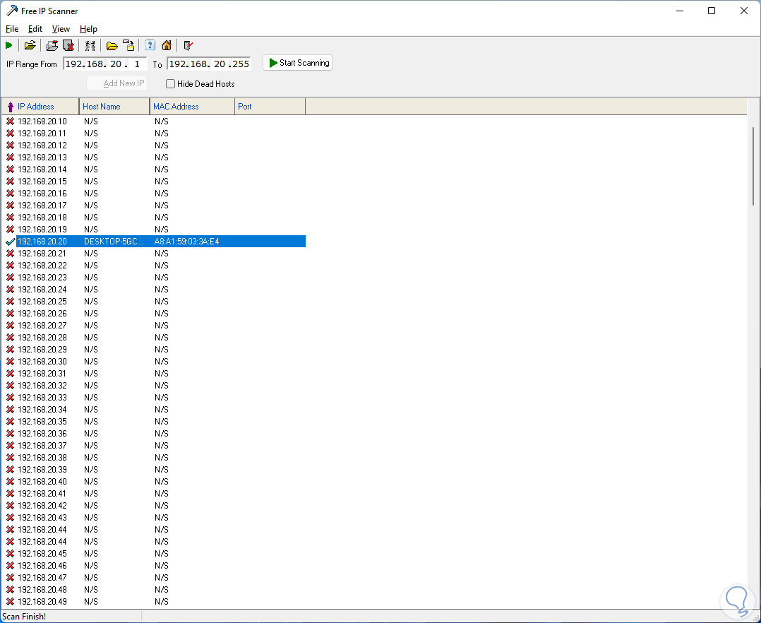 Las IP con signo de verificación son IP válidas y activas y las demás con signo X significan que no están asignadas a un equipo, podemos ver el nombre del equipo y su dirección MAC en los equipos activos: