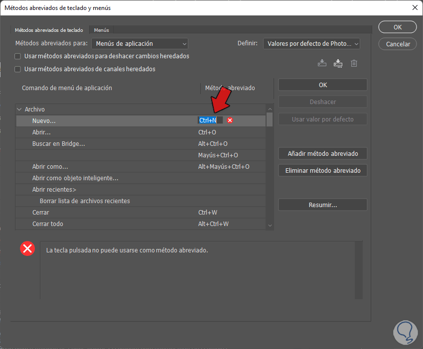Para editar uno de los atajos haremos doble clic sobre el que queremos editar. Después con tu teclado ejecuta la combinación de teclas nueva. En caso de elegir una combinación ya existente te aparecerá el aviso: