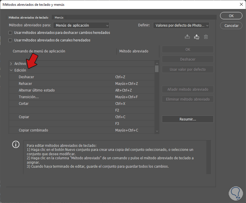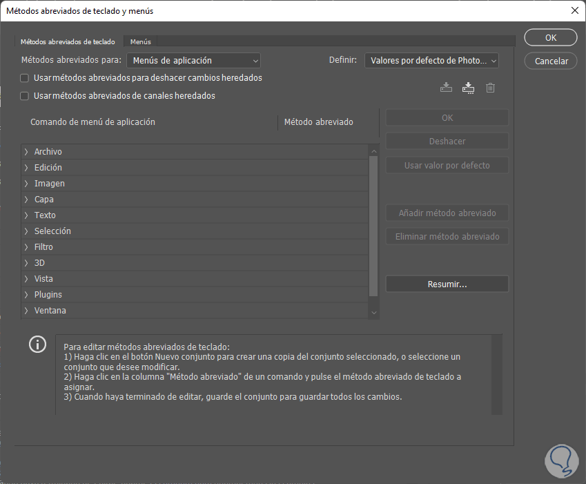 Aquí podemos elegir el listado de atajos de teclado configurados en Photoshop según la categoría desde “Métodos abreviados para:”