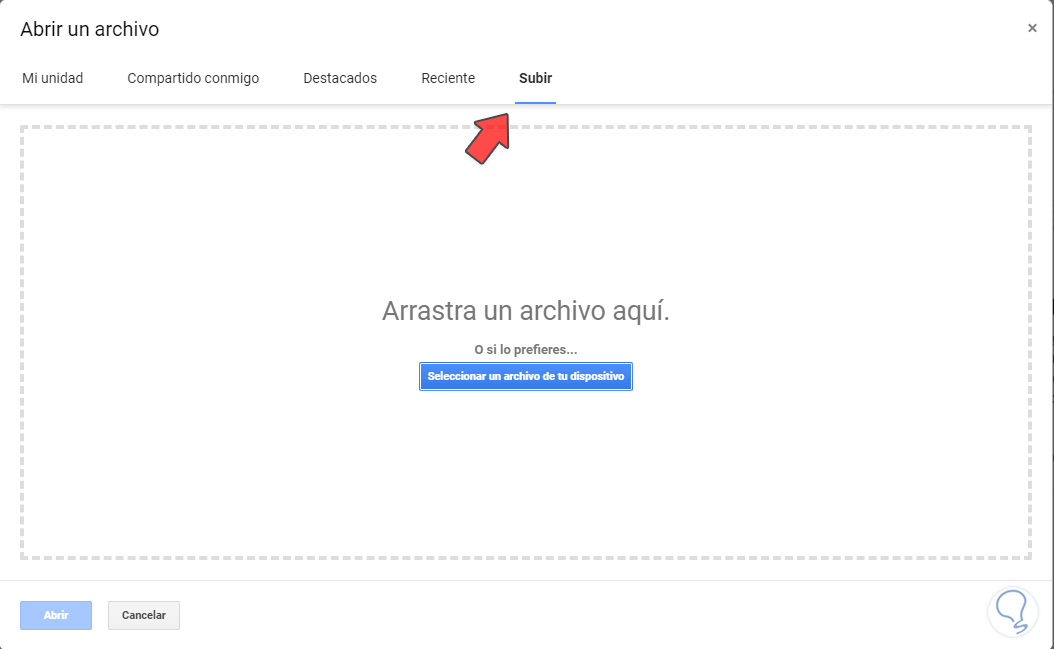 Aquí elegiremos una de las opciones para cargar nuestro documento. En este caso vamos a elegir “Subir” para poder cargar nuestro documento desde el propio PC. Buscamos o arrastramos el Word.