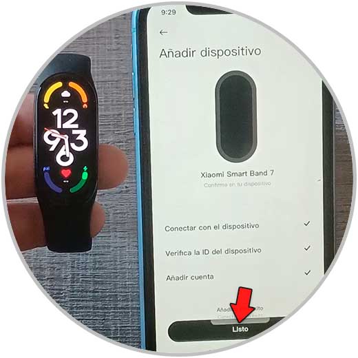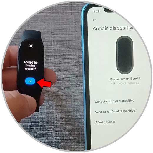 Comenzará el proceso de vinculación. Para que se efectúe correctamente tienes que pulsar en el check que aparece en la pantalla de la banda.