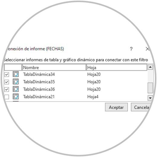 Una vez que entramos en conexión de informes, debemos seleccionar las Tablas dinámicas que queremos conectar con la segmentación de datos. Siguiendo con el ejemplo, nosotros hemos seleccionado todas las tablas dinámicas que están en concreto en una hoja de Excel de nuestro documentos, que es la Hoja 20.