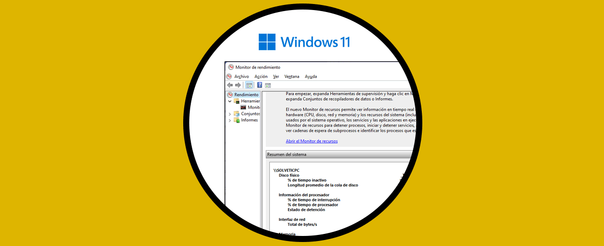 Como su nombre lo indica, esta es una utilidad integrada en Windows 11 con la cual es posible ver en tiempo real el estado a nivel de rendimiento de algunos criterios y parámetros del sistema, adicional es posible programar análisis para su posterior revisión.