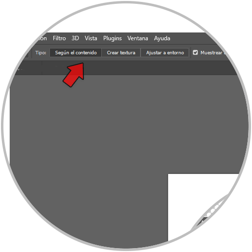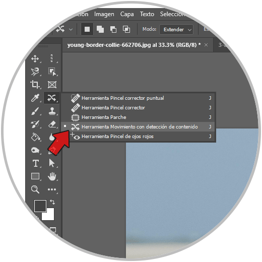 Seleccionamos la herramienta de Movimiento con detección de contenido desde el panel de herramientas. Si no te aparece mantén pulsado sobre la que salga y después elige la que te interesa.