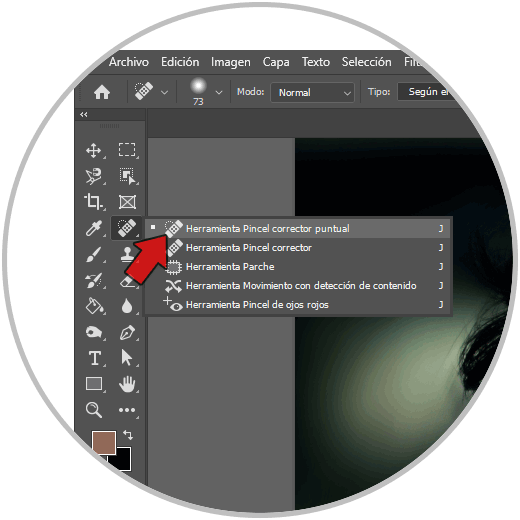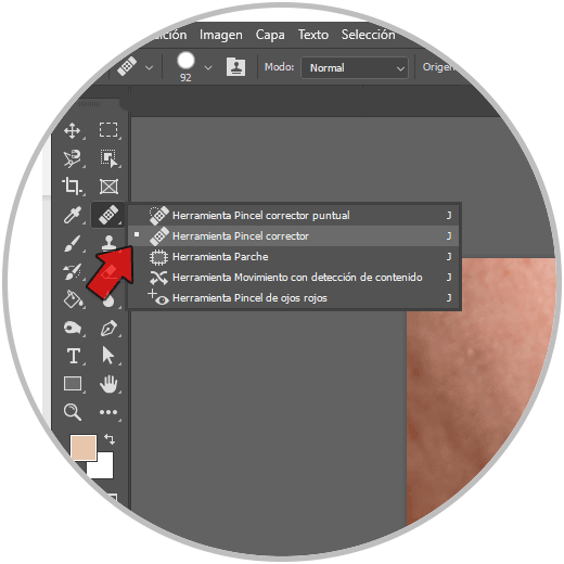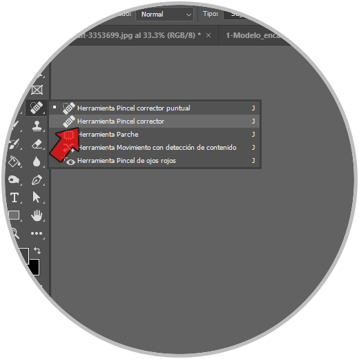 Podemos ir al panel de herramientas para encontrar el Pincel corrector.