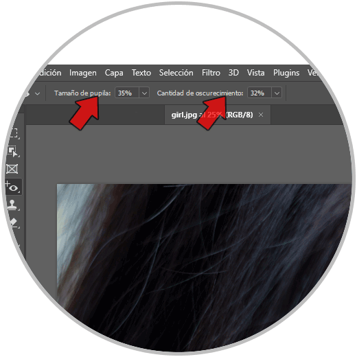 Tamaño de pupila. Elegiremos más o menos área donde afectará la corrección de ojos rojos.