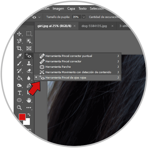 Lo primero será ir al panel de herramientas y donde encontramos las herramientas de corrección elegiremos “Pincel de ojos rojos”. SI no te aparece mantén pulsado para seleccionarla.
