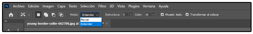 - Modo. Aquí puedes elegir el Modo movimiento si quieres desplazar la selección a una ubicación diferente y que el hueco sea rellenado automáticamente. Elige “Extender” si quieres que la selección se duplique en otra ubicación y se fusione con la imagen.