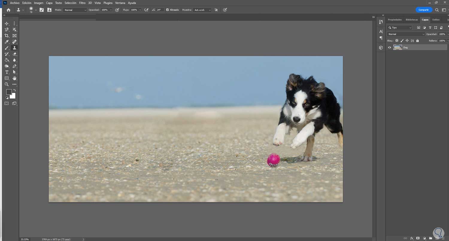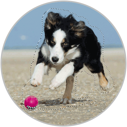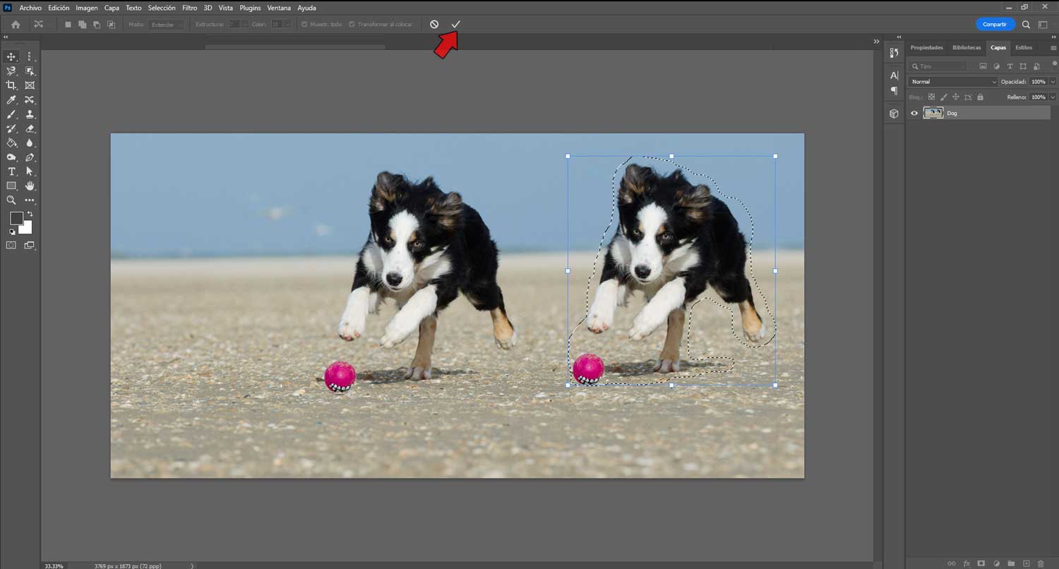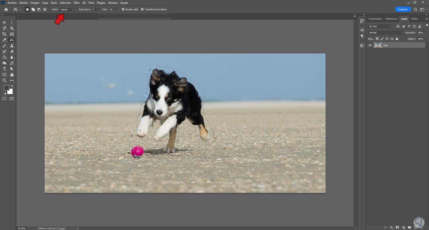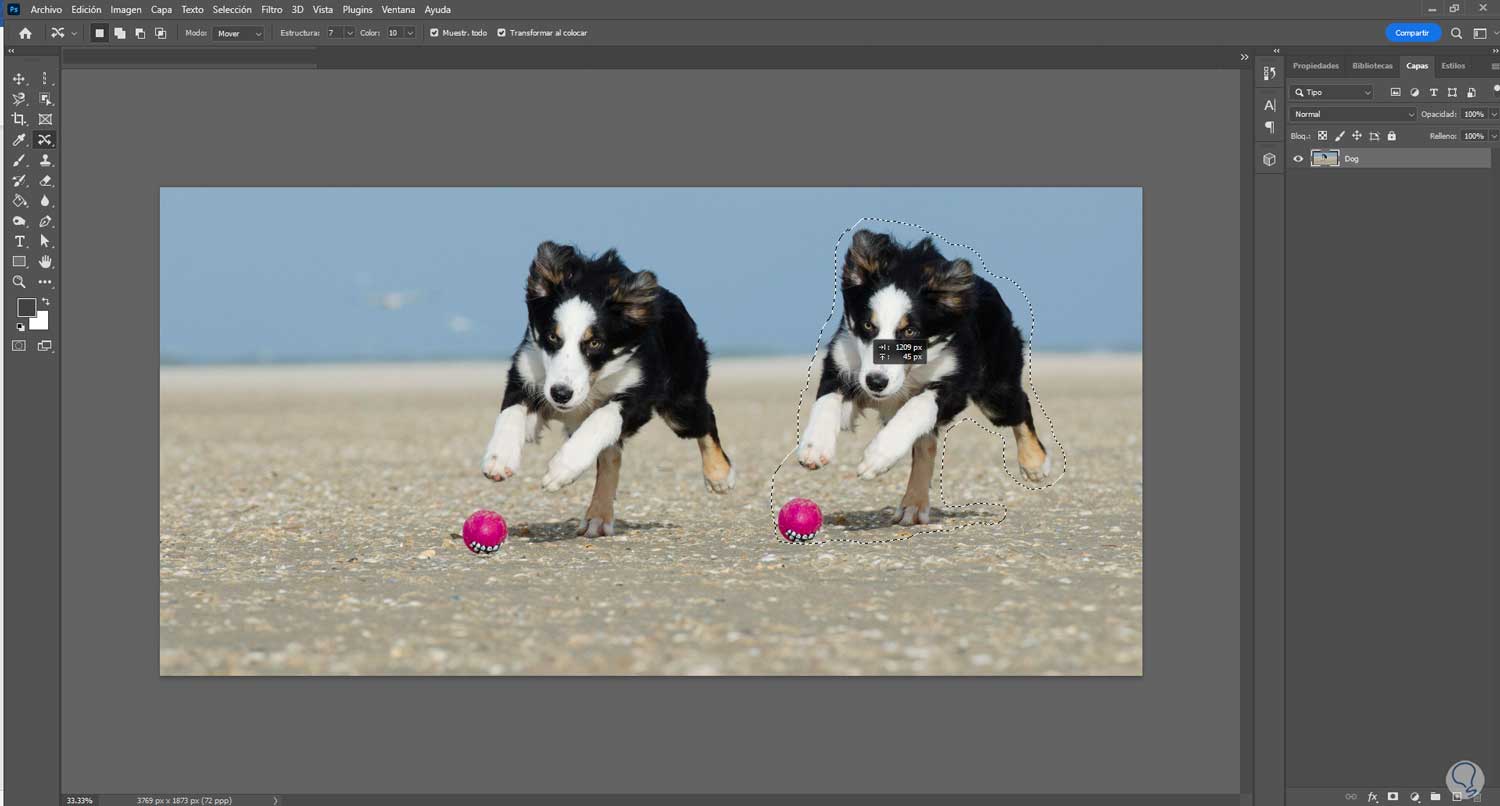 En este caso queremos trabajar con la imagen de un perro que vamos a mover y a duplicar. Para ambas acciones primero vamos a hacer una selección alrededor de lo que queremos mover. Ten en cuenta las sombras cuando hagas la selección: