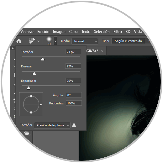 Desde la parte superior podemos configurar el tamaño del pincel así como el modo de fusión.