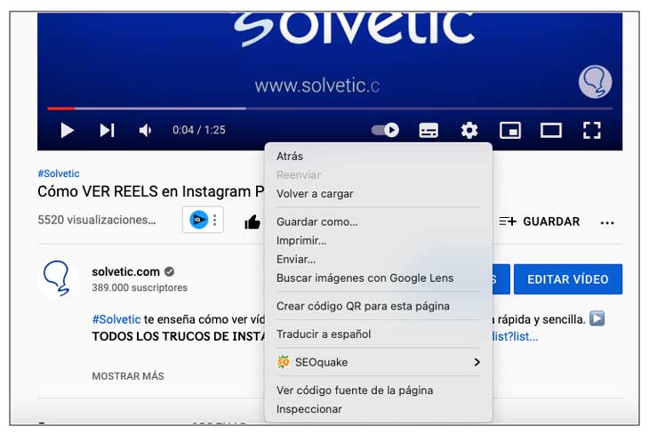 Existen diferentes herramientas para saber qué palabras clave ha usado la competencia para posicionar sus vídeos, pero lo cierto es que al igual que en web lo podemos hacer de manera directa sin tener que instalar ningún tipo de programa. Para ello utilizaremos la opción de inspeccionar la página en la que se encuentra el vídeo de YouTube que queremos analizar.