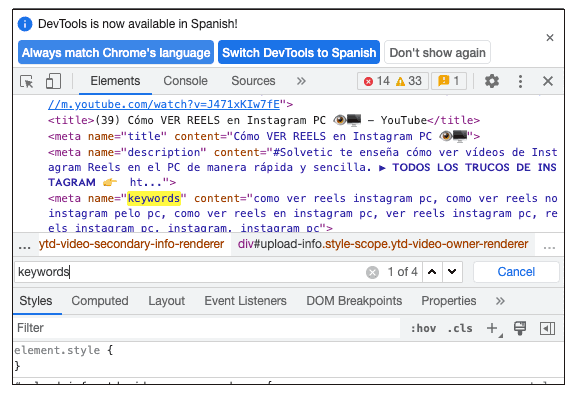 En este buscador debes escribir la palabra de "keywords" para que las encuentre. Finalmente verás que aparecen todas las Keywords que se han usado para crear ese vídeo después de la palabra "content". Estas son las palabras clave que ese canal ha utilizado para posicionar ese vídeo, junto con el título y la descripción.