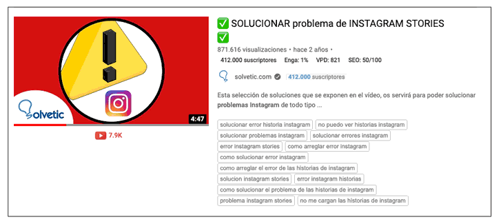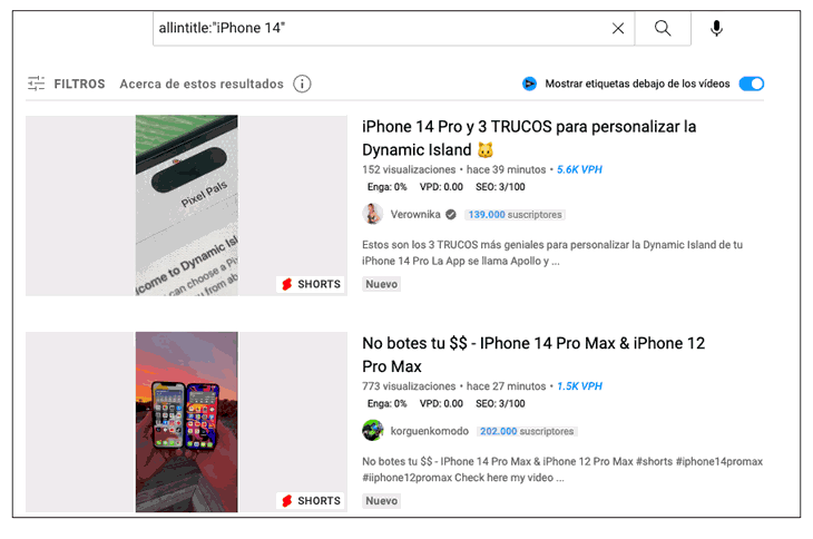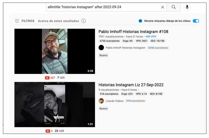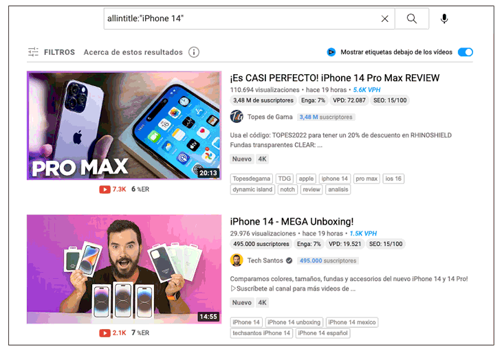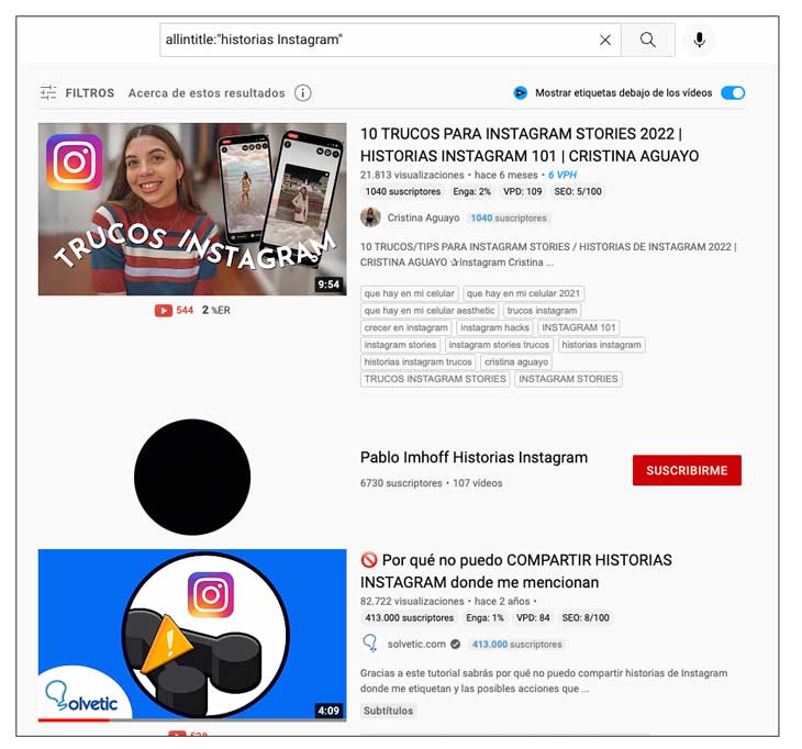 Verás que también aparecen las palabras clave usadas debajo de cada uno de los vídeos tras realizar la búsqueda en el buscador.