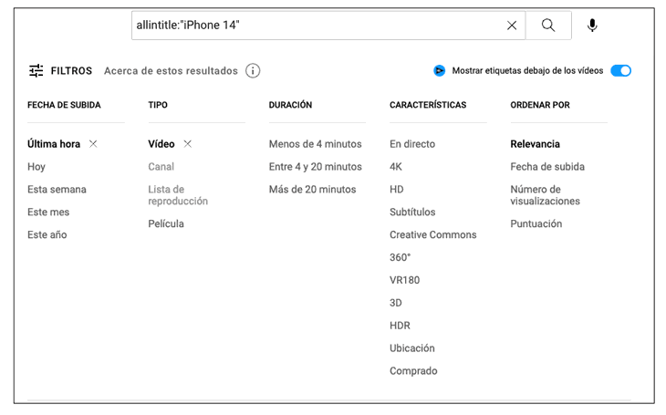 Lo primero que debes hacer es entrar en el buscador del canal de YouTube que quieres analizar y poner allintitle: + tus palabras clave seguido de after: y la fecha por la que quieres filtrar , por ejemplo: