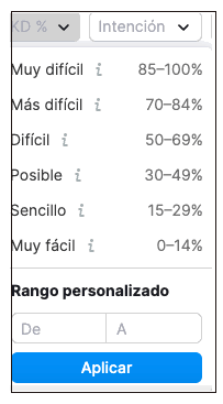 - Keyword Difficulty: Esta métrica es un porcentaje que oscila entre 1-100%. Cuanto más alto sea, más difícil será superar a tus competidores en los resultados orgánicos.