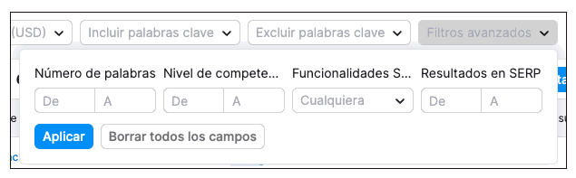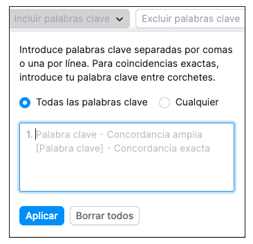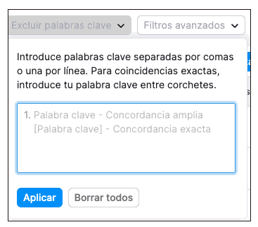 Este tipo de filtros, nos permitirá ampliar o reducir la lista de términos que estamos viendo relacionados con nuestra palabra clave.
