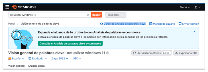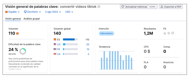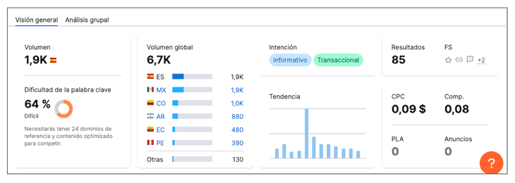 Ahora verás que la herramienta de Semrush arroja resultados para esta palabra clave. Podremos ver diferentes métricas según selecciones unas pestañas u otras.