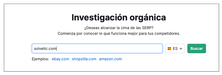 Lo primero que debes hacer es pulsar en el apartado de "Investigación orgánica" en el menú lateral de la herramienta dentro del menú de SEO. Una vez que aparezca el buscador, debes introducir el dominio que quieres analizar, que en este caso será el nuestro. Pulsa en buscar.