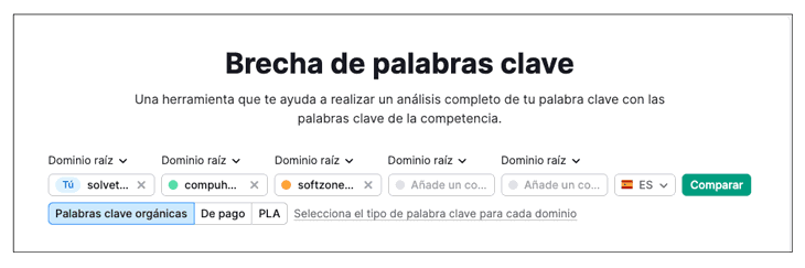 Lo primero que debes hacer es seleccionar el lateral el apartado de "Brechas de palabras clave" del menús SEO. Una vez aquí debes poner tu dominio y todos aquellos que quieres analizar de la competencia para poder analizarlos junto con el tuyo en cuanto a las palabras clave. Selecciona también "Palabras orgánicas" en este caso.