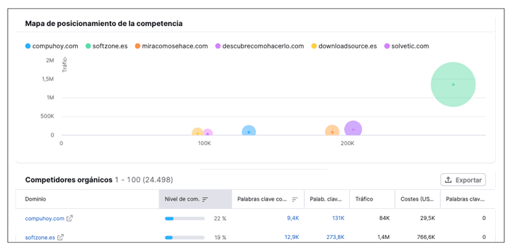 Competidores: Estos competidores son tus dominios raíz. La lista está ordenada por Nivel de competencia y la métrica te muestra cómo de cerca está un competidor del site analizado. Está basada en el número total de palabras clave por las que está posicionado el competidor y el porcentaje que comparte con la web analizada.