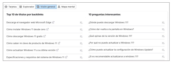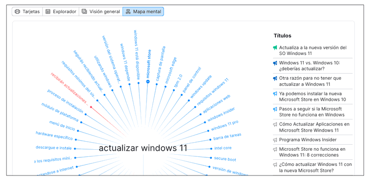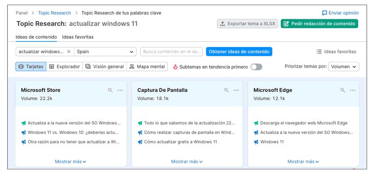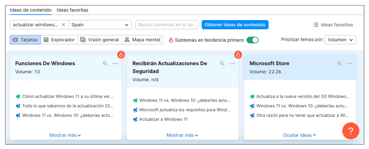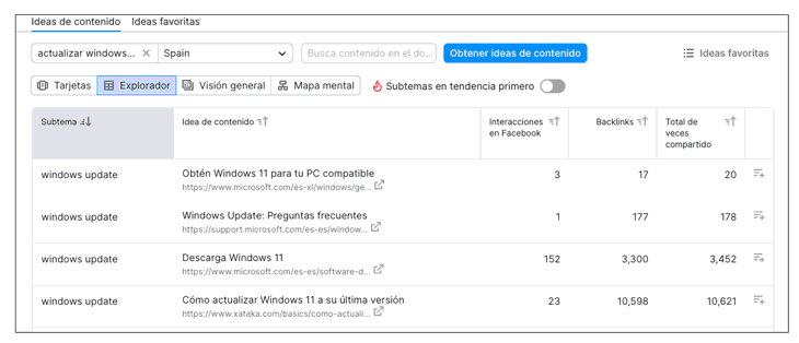 Con esta opción vas a poder encontrar los temas que son tendencia, generar ideas de contenido y ver qué palabras clave utilizar para tus títulos. Será muy útil para analizar un término o temática que quieras incluir en tu web creando contenido. De este modo podrás ver qué resultados arroja la herramienta en base a lo que es tendencia en ese momento con relación a ese término.