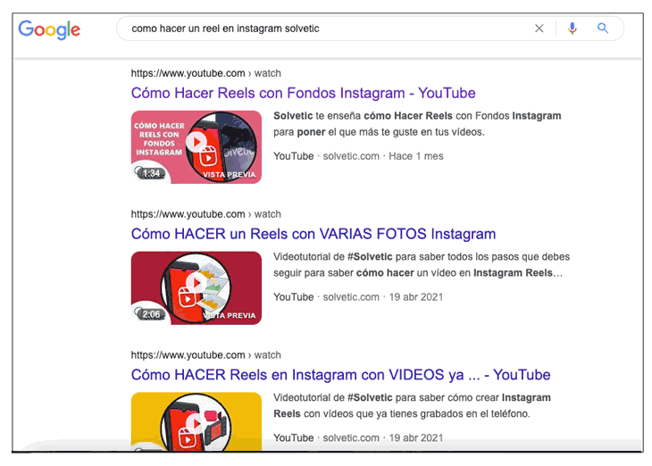 - Vídeos (Símbolo de un vídeo): Resultados de vídeo con una miniatura que se muestran junto con otros resultados de búsquedas orgánicas.