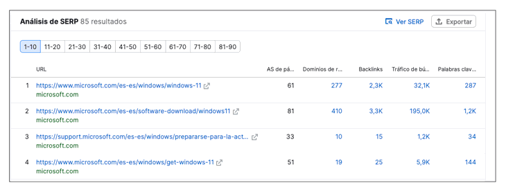 Ahora nos deslizamos hacia abajo, y verás que existe un análisis del SERP. En este caso veremos los 100 primeros resultados de Google que aparecen con la palabra clave analizada. Podrás ver las métricas principales del ranking de la URL con tu palabra clave y podrás usar esta información para generar ideas sobre cómo superar a tus competidores.