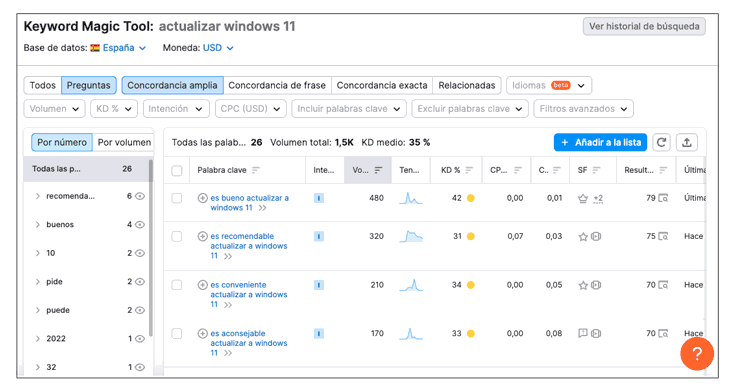 Podrás ir jugando con todas estas opciones, aplicación diferentes filtros para cada una de ellas y de este modo obtener grandes grupos de palabras clave con los que poder sacar ideas de contenido o para agregar en la temática de tu post.