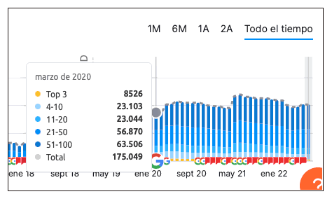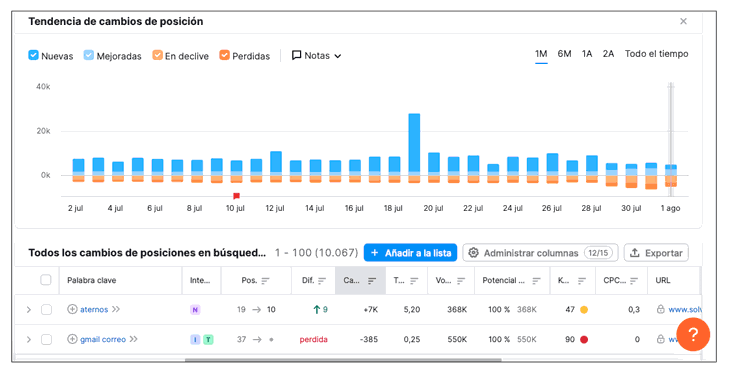 Cambios de posición: Desde aquí vas a poder ver como han ido cambiando de posición las diferentes palabras clave para el site analizado y ver en cuales has ganado o perdido posicionamiento.