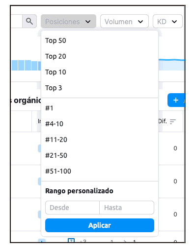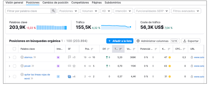 Posiciones: Aquí podrás ver los datos más relevantes sobre las palabras clave que están posicionando para el site analizado, y podrás ordenar este dato desde las que posicionan primero, hasta las que están en el lugar 100.