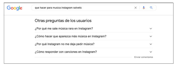 - Otras preguntas de los usuarios (Símbolo de bocadillo): Una selección de preguntas relacionadas con una consulta de búsqueda determinada que aparece en una tabla expandible titulada "Otras preguntas de los usuarios" entre los resultados de búsqueda.