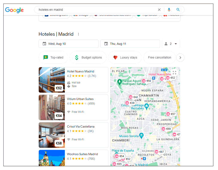 - Pack de hoteles: Un bloque que muestra hoteles relacionados con una consulta de búsqueda determinada. Los resultados de hoteles incluyen información sobre tarifas y valoraciones y permiten a los usuarios consultar la disponibilidad para fechas concretas.
