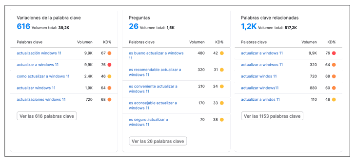 Con todos estos datos analizados, podrás determinar qué palabras clave merecen la pena utilizarse y qué tipo de contenido puedes crear en base a todas las sugerencias que se ofrecen. Además podrás ver el tipo de competencia que tienes para esa Keyword y cómo son las métricas para las web que ya la están posicionado.