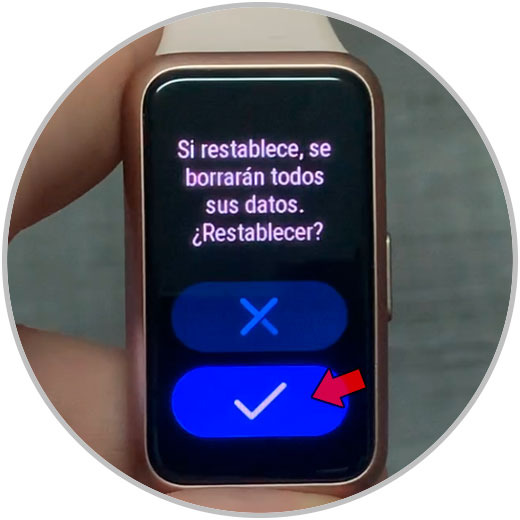 Esto borrará todos los datos de la banda. Confirmamos en el check azul y cuando se reinicie tu Huawei Band 7 habrá borrado todos sus datos y estará lista para volver a vincular.