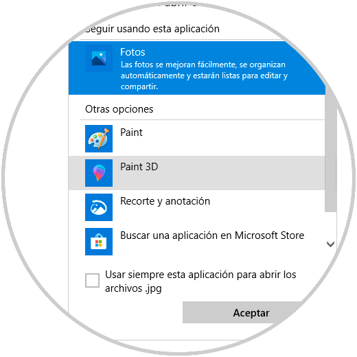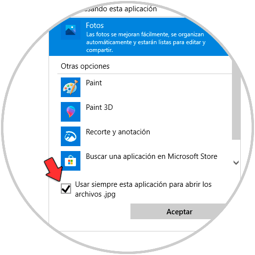 Seleccionamos "Fotos" y activamos la casilla "Usar siempre esta aplicación para abrir los archivos":