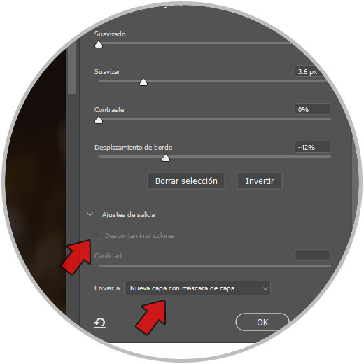 Por último activaremos “Descontaminar colores” si está disponible. En “Enviar a” elegimos la opción de “Nueva capa con máscara de capa”. Pulsamos en OK