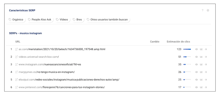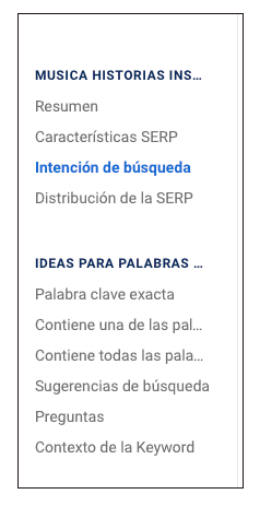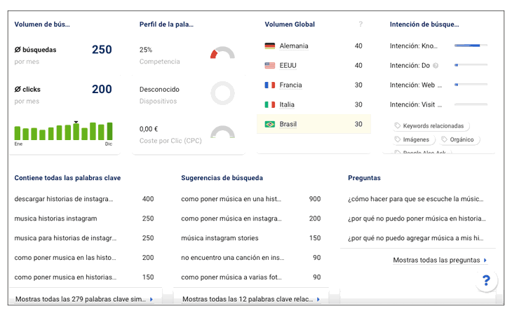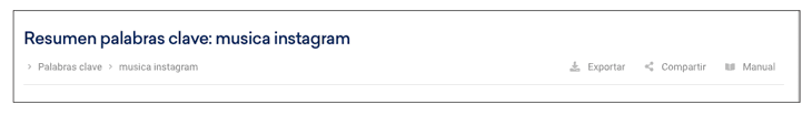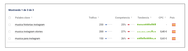 Ahora verás que aparecen los resultados para todas las palabras clave que has introducido. En base a esto selecciona la que mejores métricas tiene. En este caso vemos que "musica historias instagram" es la que más volumen tienen y menos competencia, por lo que será la que más oportunidad tengamos de posicionar y mejores resultados obtengamos.