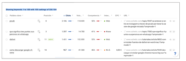 De este modo vas a poder las oportunidades que tienes para mejorar tu contenido fijándote por ejemplo en la posición, ya que así podrás mejorar el contenido creado para a una palabra clave que tenga buen volumen pero que no esté posicionada en lo más alto, optimizando su contenido y aumentando de este modo el número de clics.