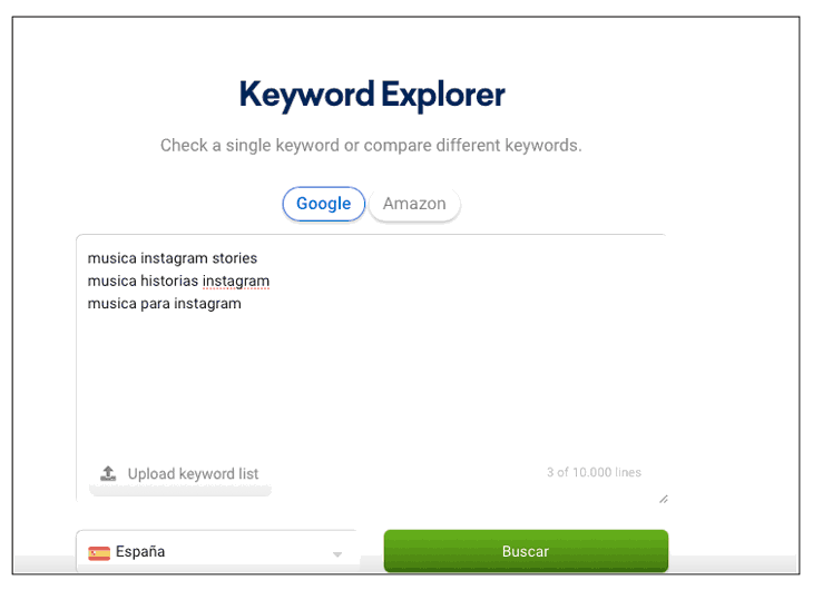 Lo siguiente que debes hacer es poner las palabras clave que quieres analizar en el buscador que aparece. Para poder separar unas de otras, debes pulsar la tecla Shift + espacio. En el caso de que tengas una lista creada (hasta 100) de palabras clave, puedes subirla directamente el buscador. Debes pulsar sobre el país que quieres hacer la búsqueda y seleccionar "buscar".