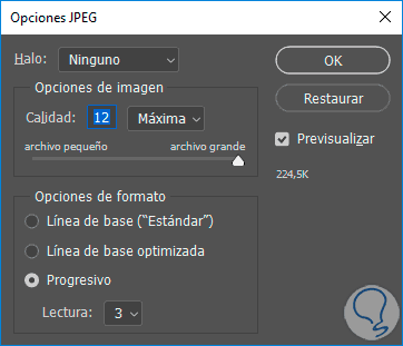 Se nos abrirá una ventana donde podremos configurar nuestro archivo de salida. Veremos que podemos elegir tanto el formato de archivo como su calidad final además de otras opciones como las de elegir el tamaño de imagen. En este caso elegiremos JPEG.