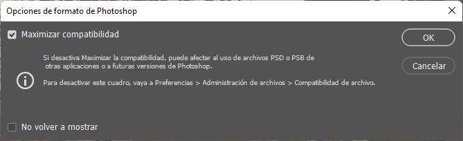 Ahora cada vez que guardemos nuestro PSB o PSD nos aparecerá esta ventana si hemos activado “Preguntar”. Si hemos puesto “Siempre” se guardará directamente con esta función de máxima compatibilidad y no nos preguntará.