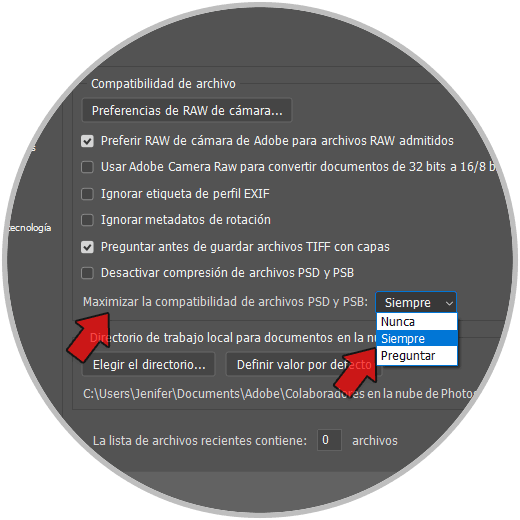Nos vamos a fijar aquí en el apartado de “Compatibilidad de archivo”. Aquí veremos la opción de “Maximizar la compatibilidad de archivos PSD y PSB”