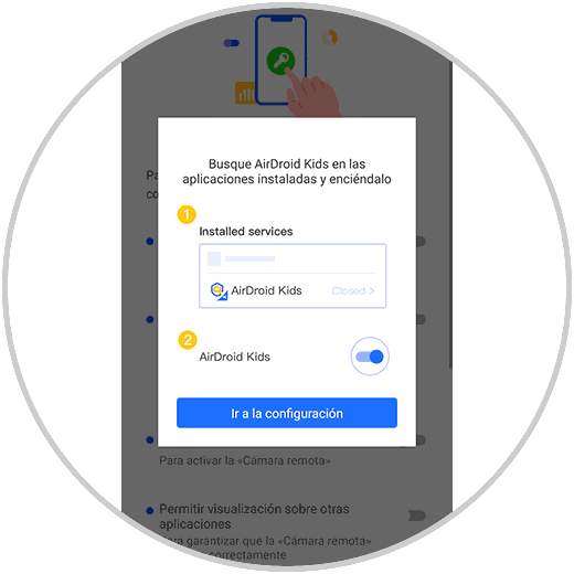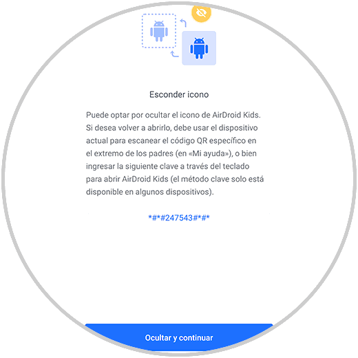 En este caso se ocultara el icono de AirDroid para no revelar que se está realizando el monitoreo de las actividades, pulsamos en “Ocultar y continuar” para finalizar la configuración: