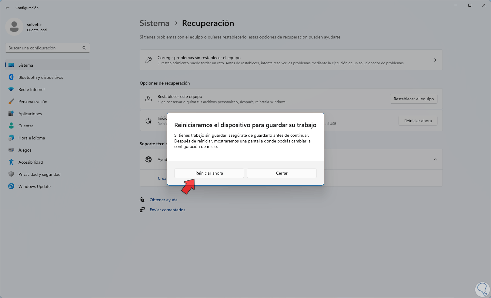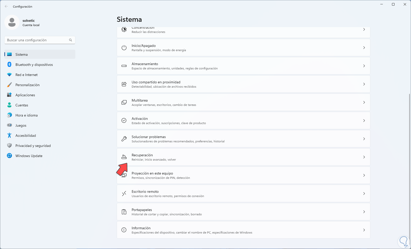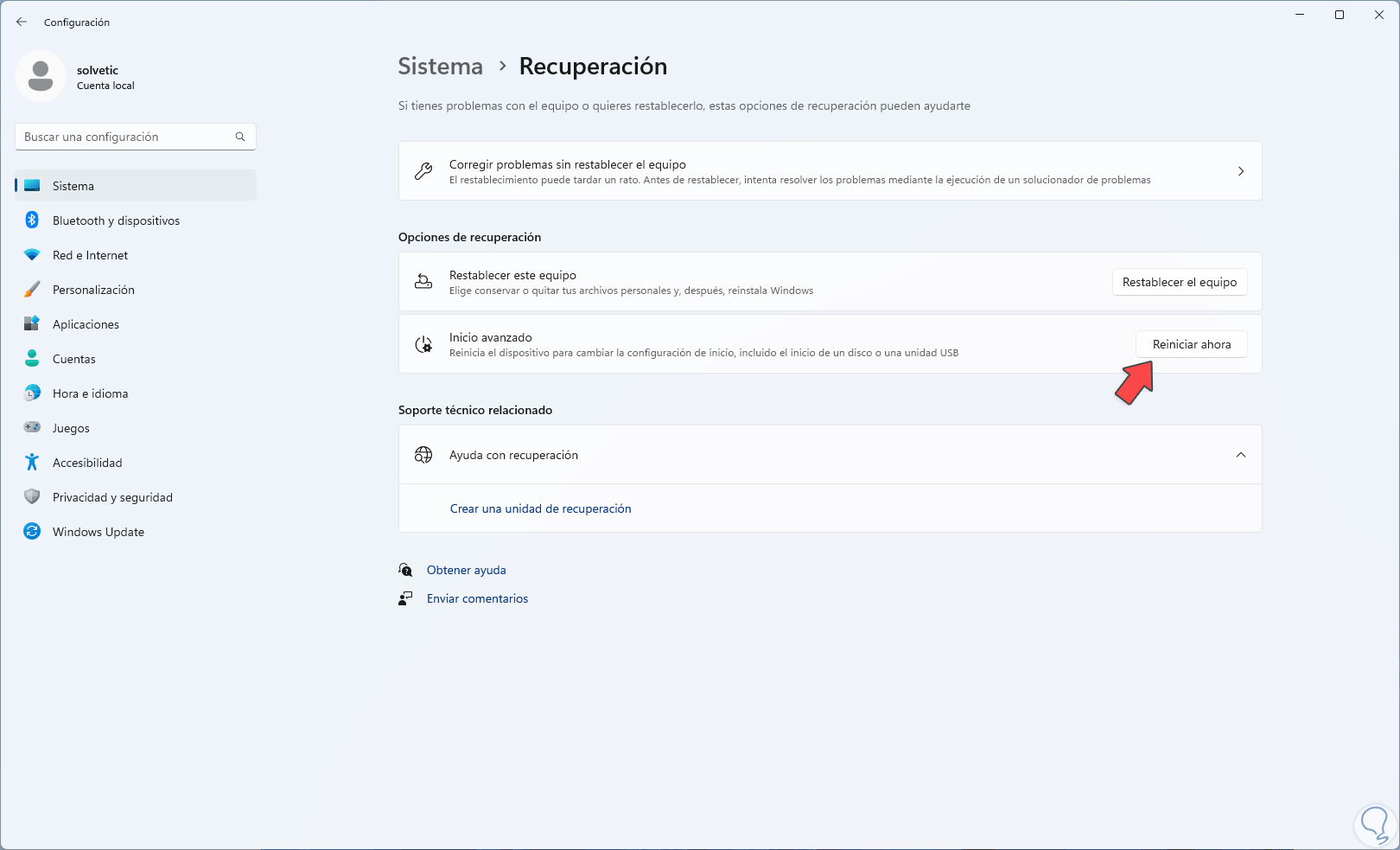 Ahora, es posible activarlo o validarlo directamente desde la BIOS o UEFI, para ello caso iremos al menú "Inicio - Configuración - Sistema - Recuperación":
