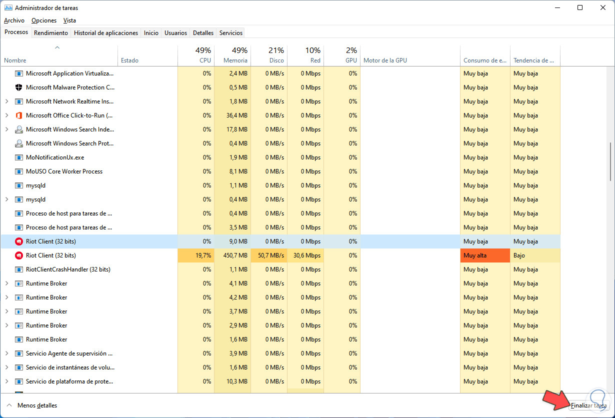 Cada programa en Windows 11 está asociado a procesos y servicios para un óptimo funcionamiento, podemos finalizar los procesos de RIOT (empresa desarrolladora de Valorant) y con ello poder abrirlo sin problemas.