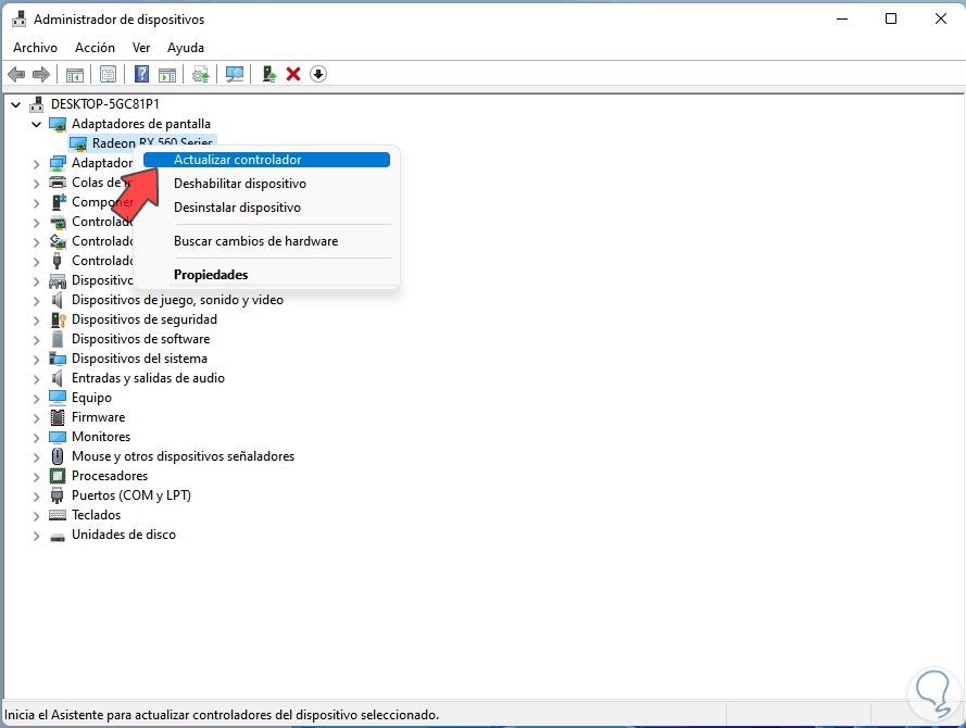 En "Adaptadores de pantalla" damos clic derecho sobre el controlador y seleccionamos "Actualizar controlador":