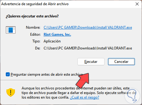 Ejecutamos el archivo para instalar Valorant. Damos clic en Ejecutar y se lanzará el asistente de instalación: